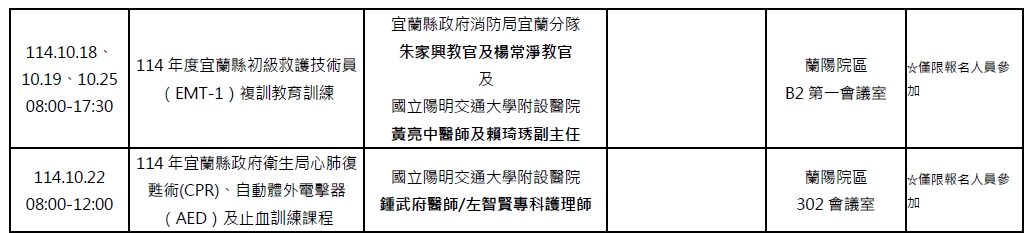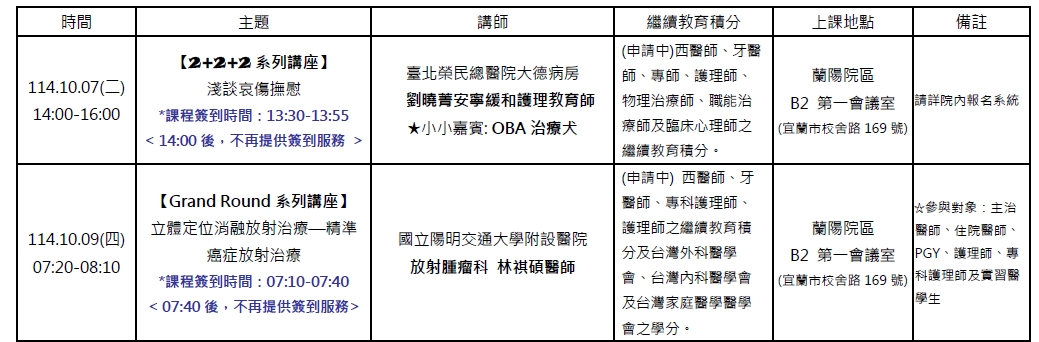 謹提供陽明交通大學附設醫院114年10月份最新課程訊息,歡迎宜蘭醫界的朋友們踴躍報名參加。