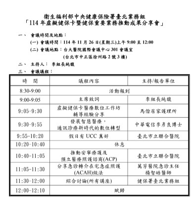 健保台北業務組 11月26日(三)上午9:00-12:00舉辦「114年虛擬健保卡暨健保重要業務推動成果分享會」