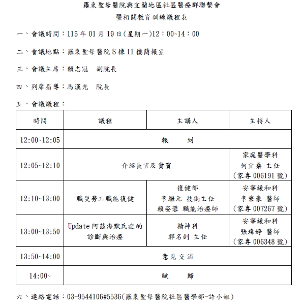 聖母醫院1月19日(一)12:00~14:00於院S棟11樓辦理「社區醫療群聯繫會」 1. 李繼元和賴姿蓉兩位治療師來分享職災勞工職能復健經驗 2. 身心科郭名釗主任分享最新的阿茲海默症診斷與治療 如欲參加請速洽9544106#5536許小姐