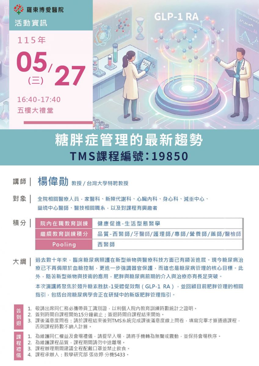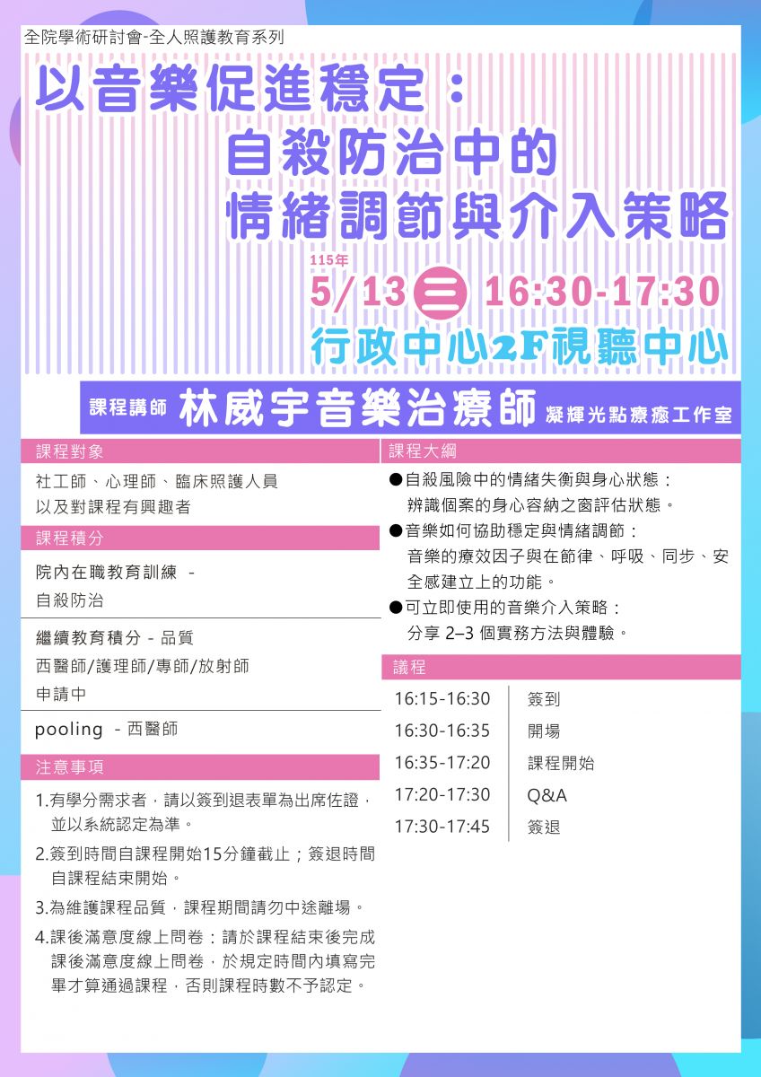 主旨:本院訂於115年5月舉辦全院學術研討會-全人照護教育系 列,請轉知所屬課程訊息,請查照。#5433