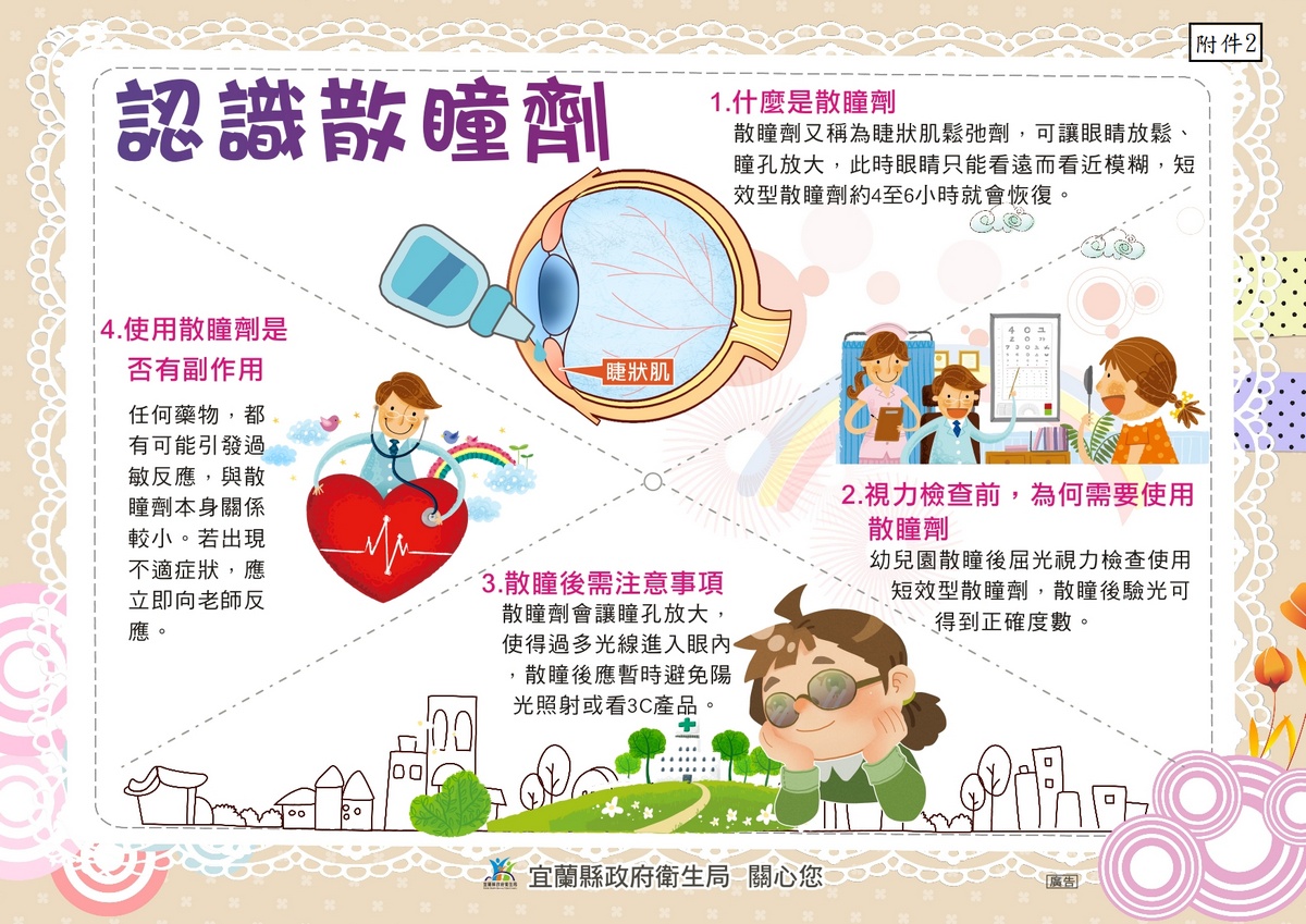 主旨:為辦理108年兒童近視預防與視力改善計畫,請貴園所依 宜蘭縣政府衛生局到校「散瞳後屈光視力檢查作業流程及 注意事項」(附件1)配合辦理,請查照。