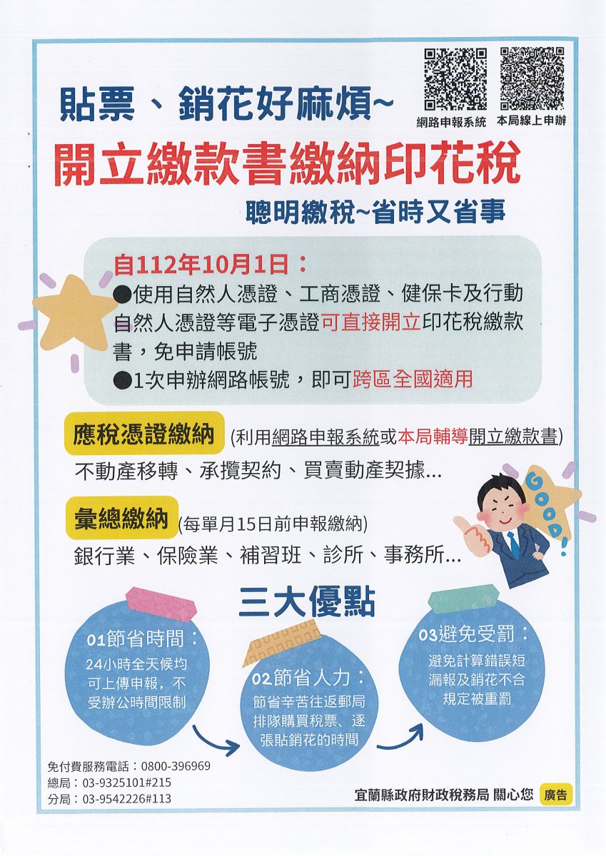 宜蘭縣政府財政稅務局函知 為順應時代趨勢,中央政府刻推動以開立繳款書或彙總繳納方式完納印花稅之政策,敬請多加利用
